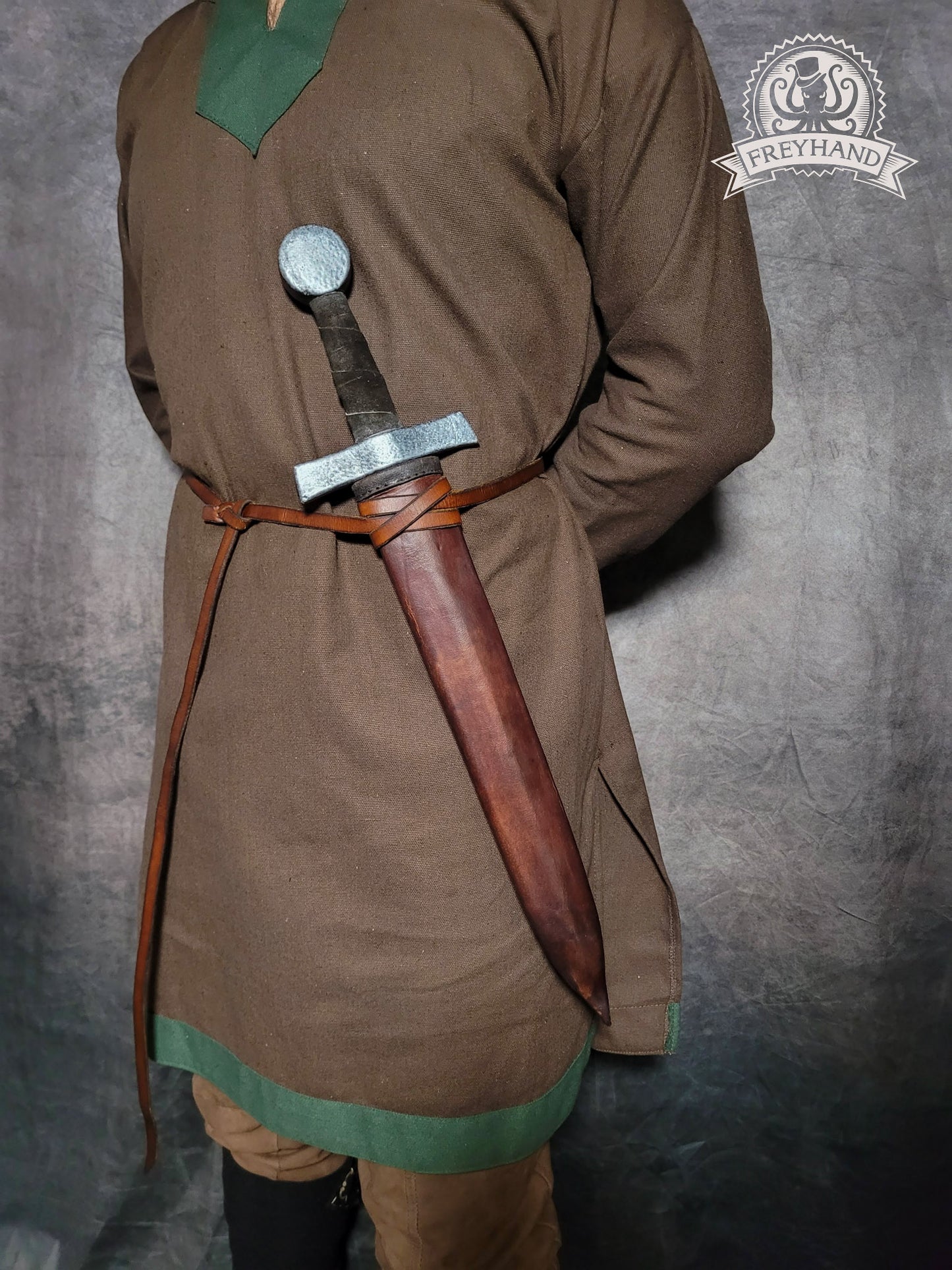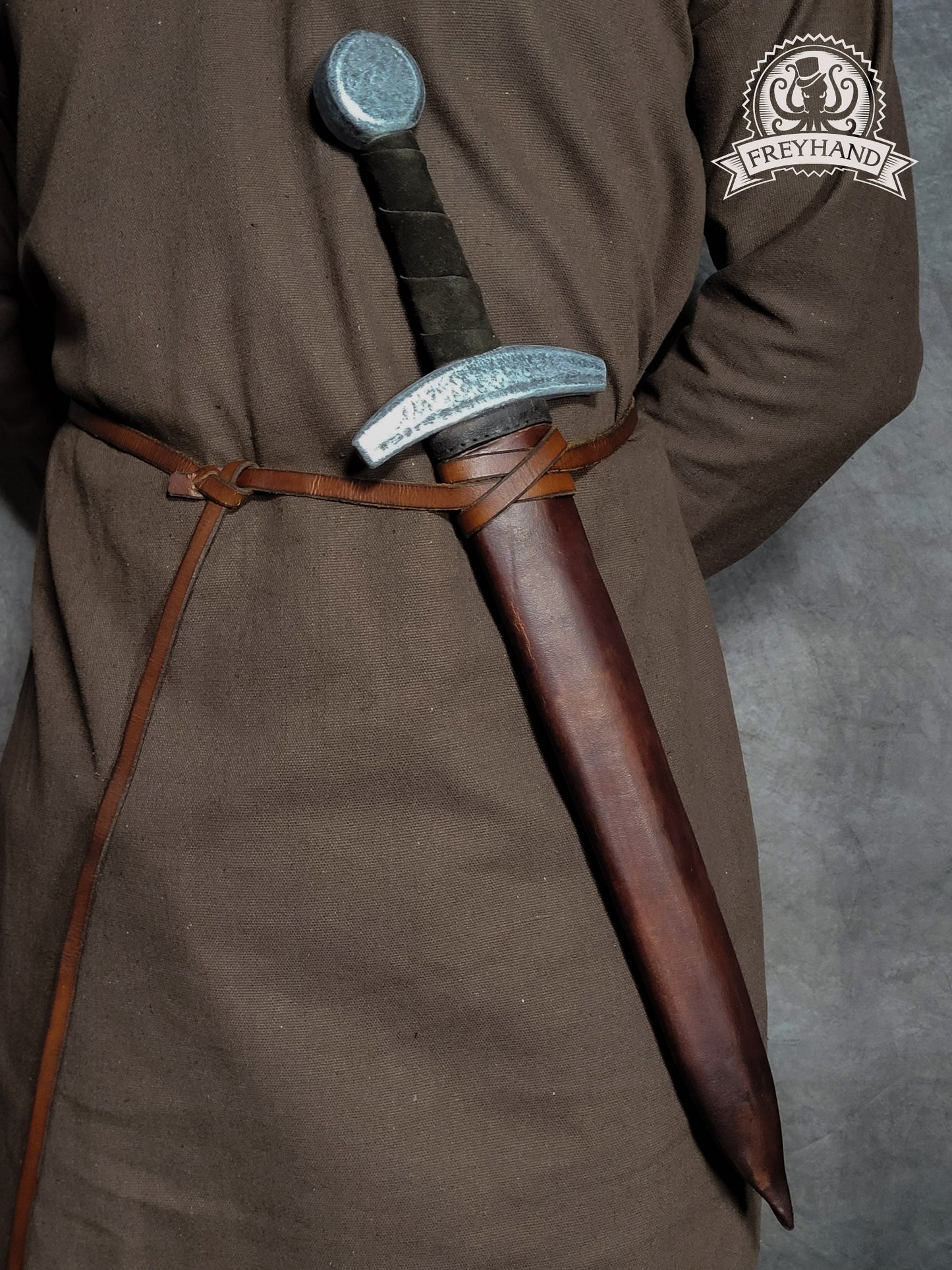 Lederscheide die zur Robin Larp Klinge und zur Frank Klinge passt. Die Scheide kann mit Gürtelhalterungen kombiniert, oder mit einem Lederband am Gürtel befestigt werden.