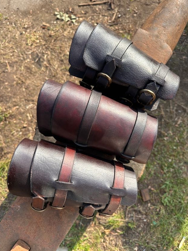 Zwei stabile Lederriemen mit Messingschnallen halten die Armschienen sicher am Unterarm. Die Konstruktion sitzt fest, schränkt aber die Bewegungsfreiheit nicht ein – perfekt für lange Tage auf dem Con, historische Darstellungen oder den Einsatz auf der Bühne.