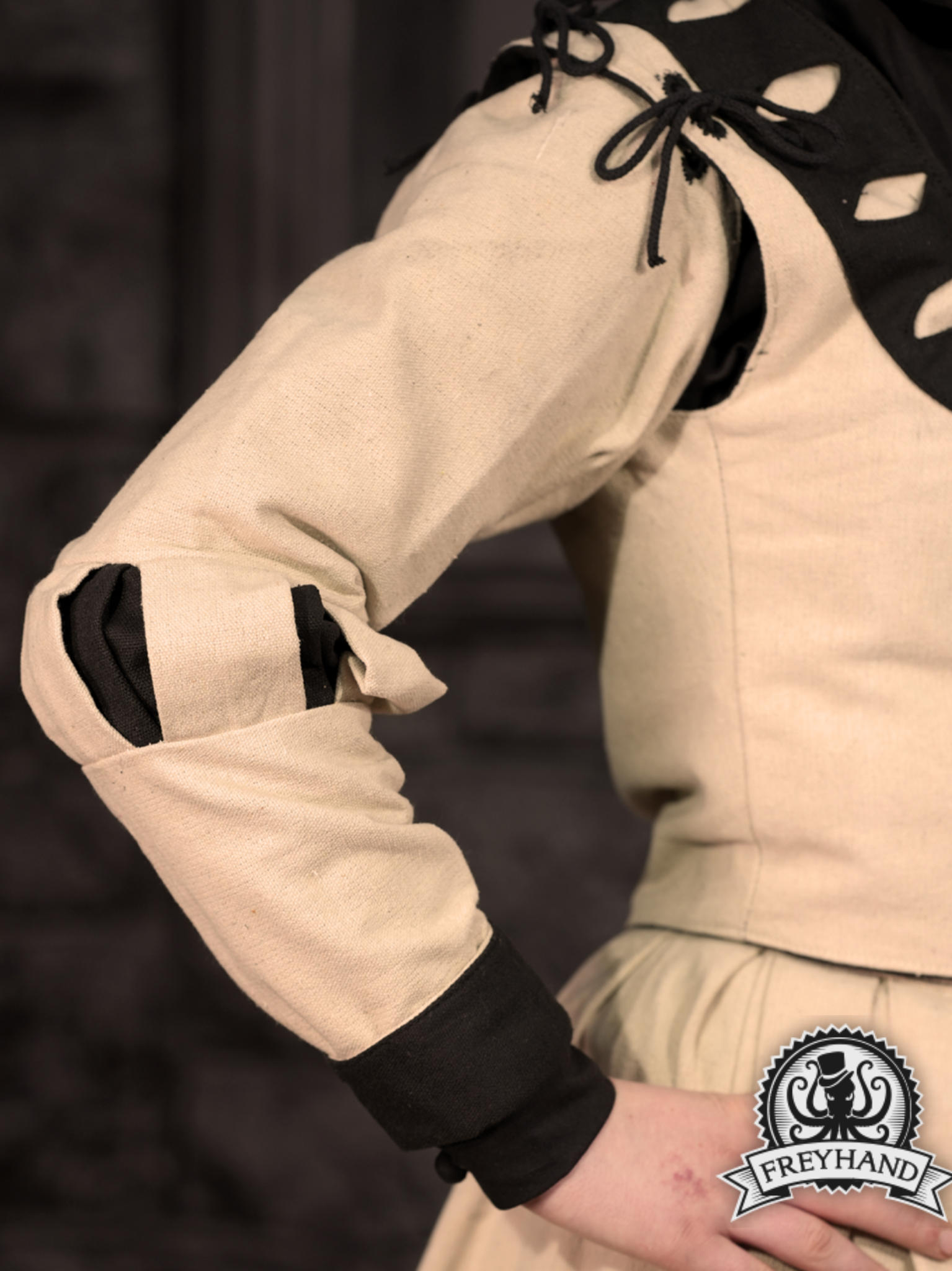 Die geschlitzte Ärmel sorgen für einen farblichen Kontrast und verleihen dem Gewand zusätzliches Flair. Das Landsknecht-Kostümset Flora bietet eine Vielzahl von Möglichkeiten, ein eindrucksvolles Kostüm für Damen, Truppendamen und Mägde zusammenzustellen.
