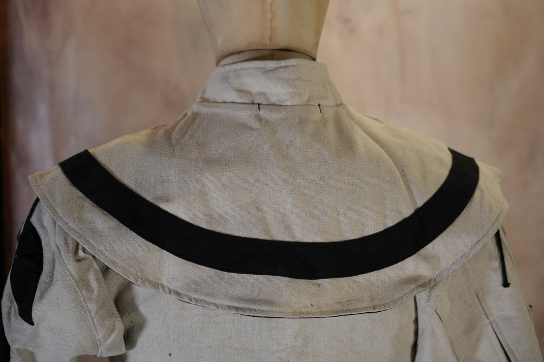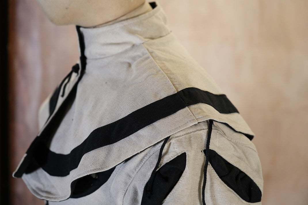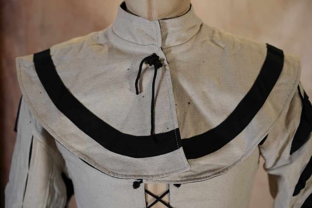Die einzelnen Teile werden mit Nestelschnüren durch handgenähte Nestellöcher gebunden (eine schlichte Baumwollversion ist im Lieferumfang enthalten). Die Pelerine kann problemlos über andere Kleidungsstücke des Sets getragen werden.