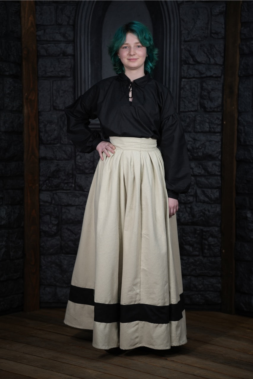 Der fließende Rock ist am unteren Ende mit einem Streifen versehen, der für einen farblichen Kontrast sorgt. Das Landsknecht Kostümset Flora bietet eine Vielzahl von Möglichkeiten, ein schickes Kostüm für Damen, Truppenfrauen und Mägde zusammenzustellen.
