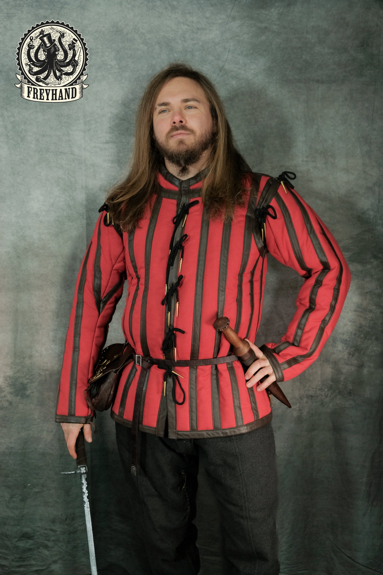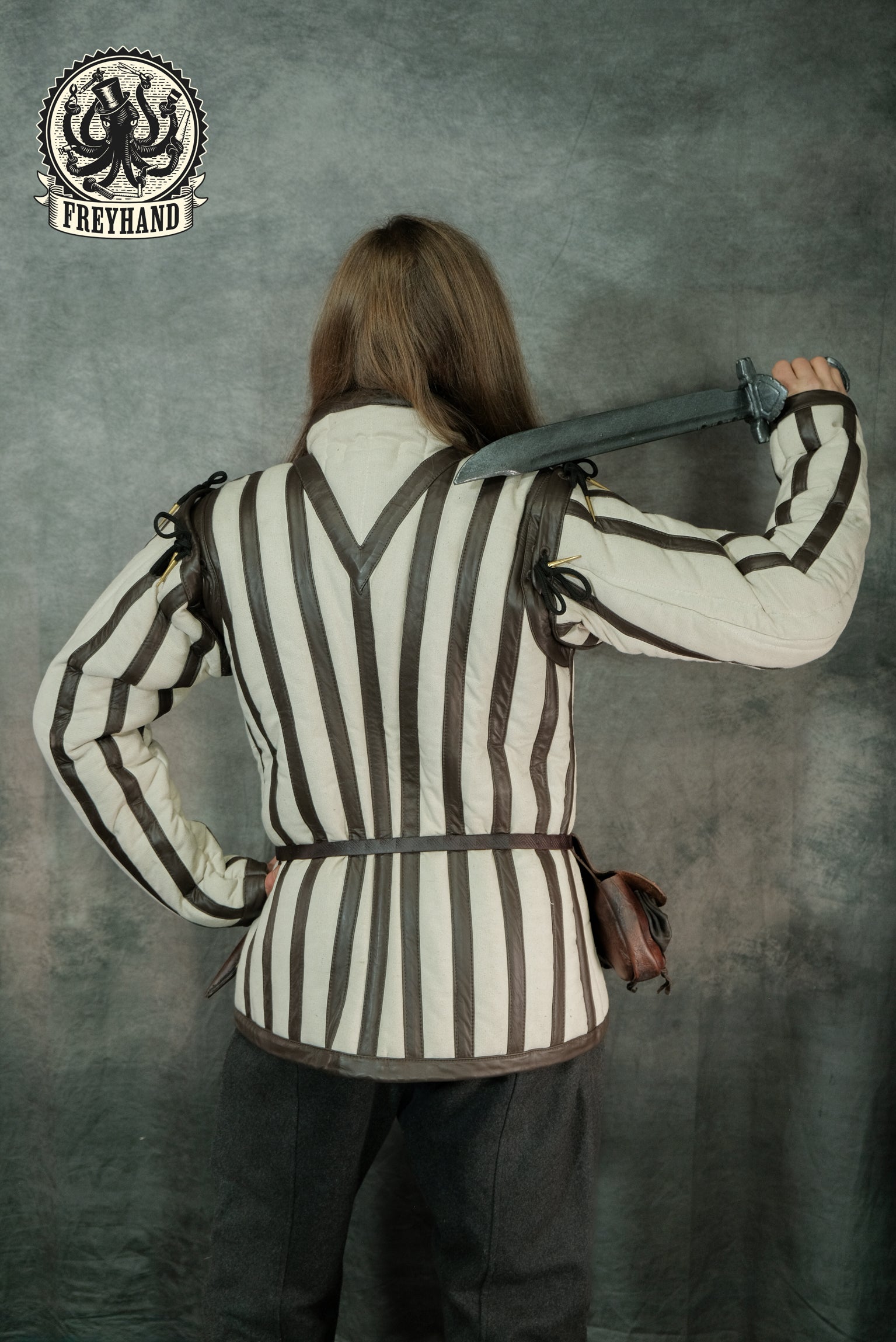 Der Gambeson "Poitiers" ist eine besonders bewegliche Polsterjacke, mit angenestelten Ärmeln und schönen Verstärkungstreifen aus Rindsleder auf den Nähten. Das Design ist Polsterjacken aus dem 14ten Jhd. nachempfunden. Das macht den Gambeson "Poitiers" zur idealen Wahl für realistische Darstellungen und anspruchsvolle Kämpferrollen.