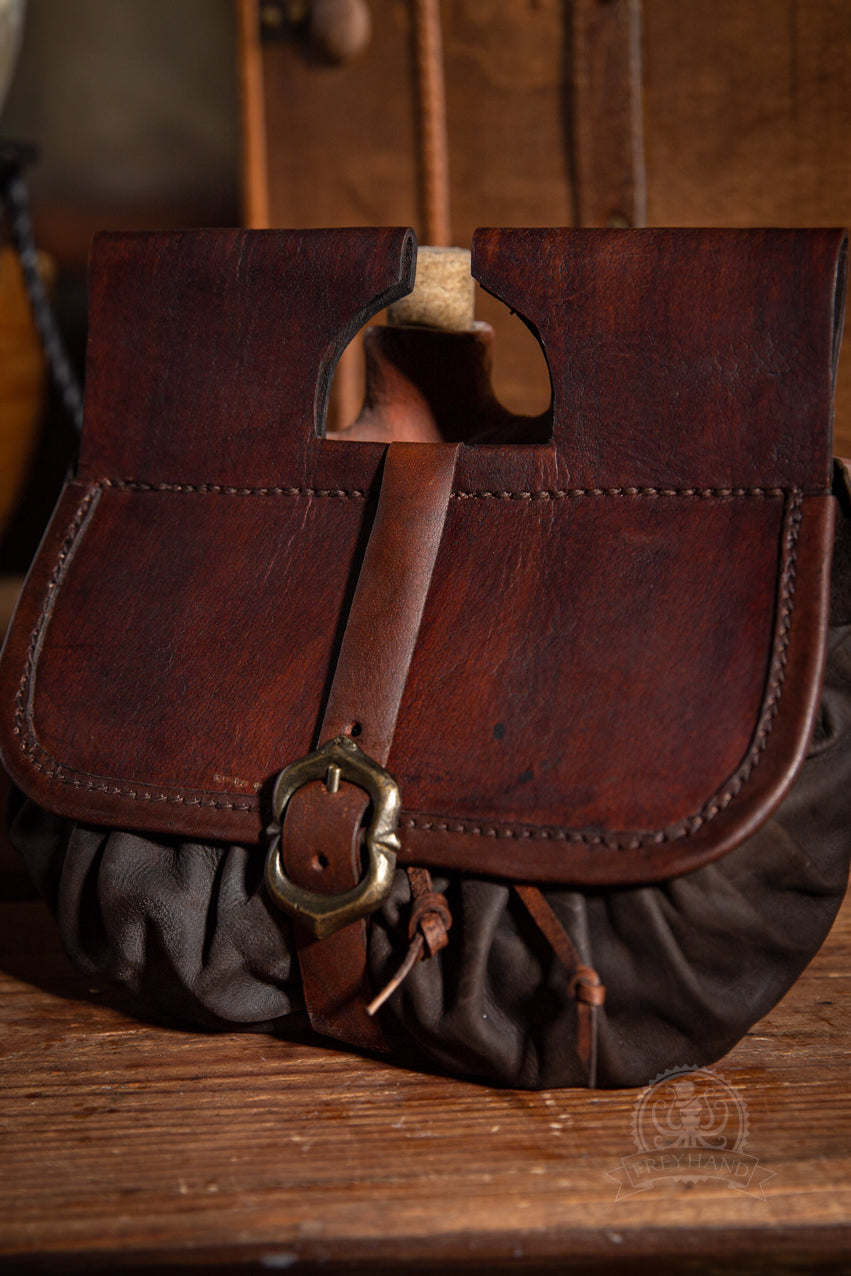 Mit unserer rechteckigen Gürteltasche Galton hast du deine Habseligkeiten stets in Griffweite. Diese Ledertasche besitzt an der Oberseite eine Klappe, die mit einer goldfarbenen Schnalle festgezurrt wird. Lederriemen dienen zum Öffnen und Schließen des Beutels. Diese Tasche bietet nicht nur unschätzbaren Stauraum, sondern ist auch eine ansehnliche Ergänzung zu einer Reihe von historischen Rollenkonzepten.