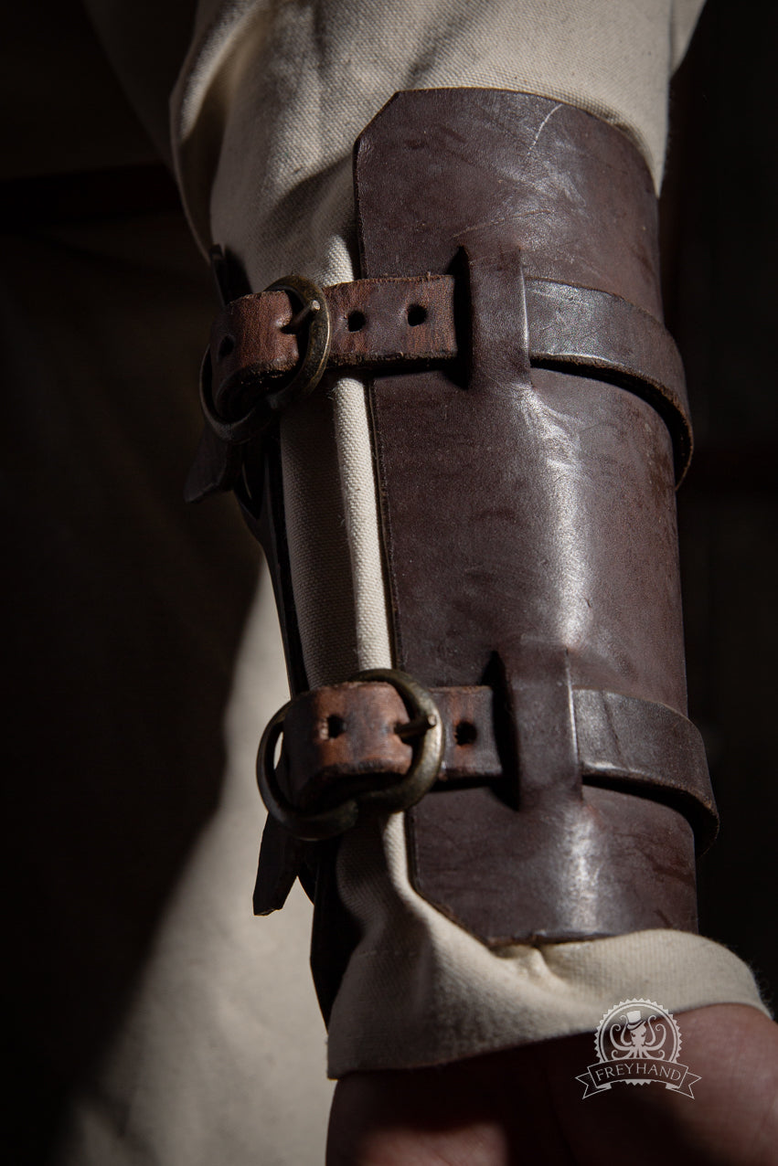 Jede Armschiene wird mit zwei stabilen Riemen und Messingschnallen sicher am Unterarm befestigt. Die durchdachte Konstruktion sorgt für festen Halt ohne einzuschränken – ideal für lange Spieltage im LARP, historische Darstellungen oder Bühnenauftritte.