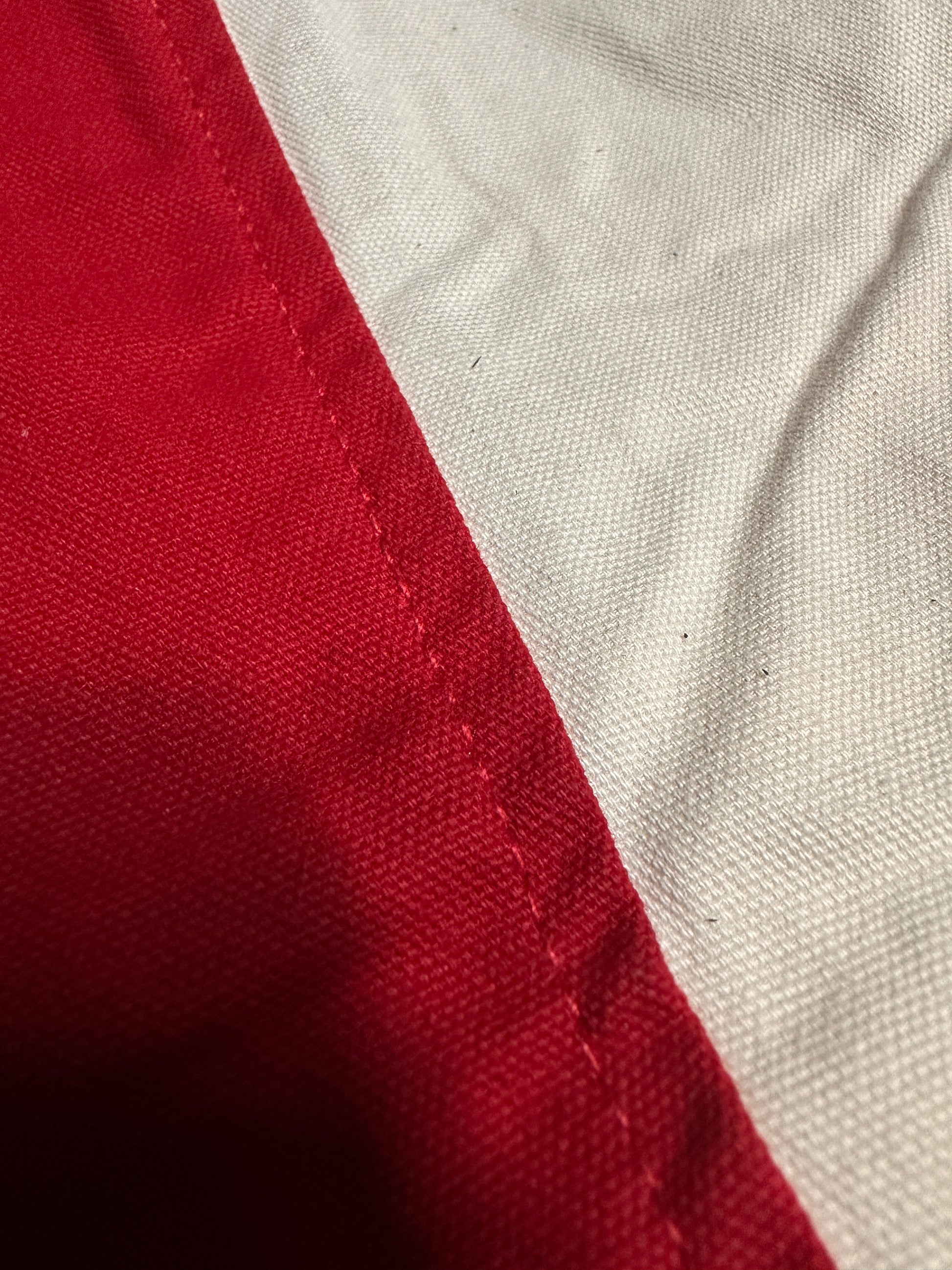 Hier handelt es sich um das reguläre Produkt in einer anderen Stoffqualität. Es ist ein fester relativ glatter Baumwollstoff. die Farben sind ein kräftiges Blutrot und ein helles Cremeweiß, heller als unsere Standardstoffe. Diese Teile werden so nicht wieder produziert und es gibt nur Hosen und Jacken in Restgrößen..
