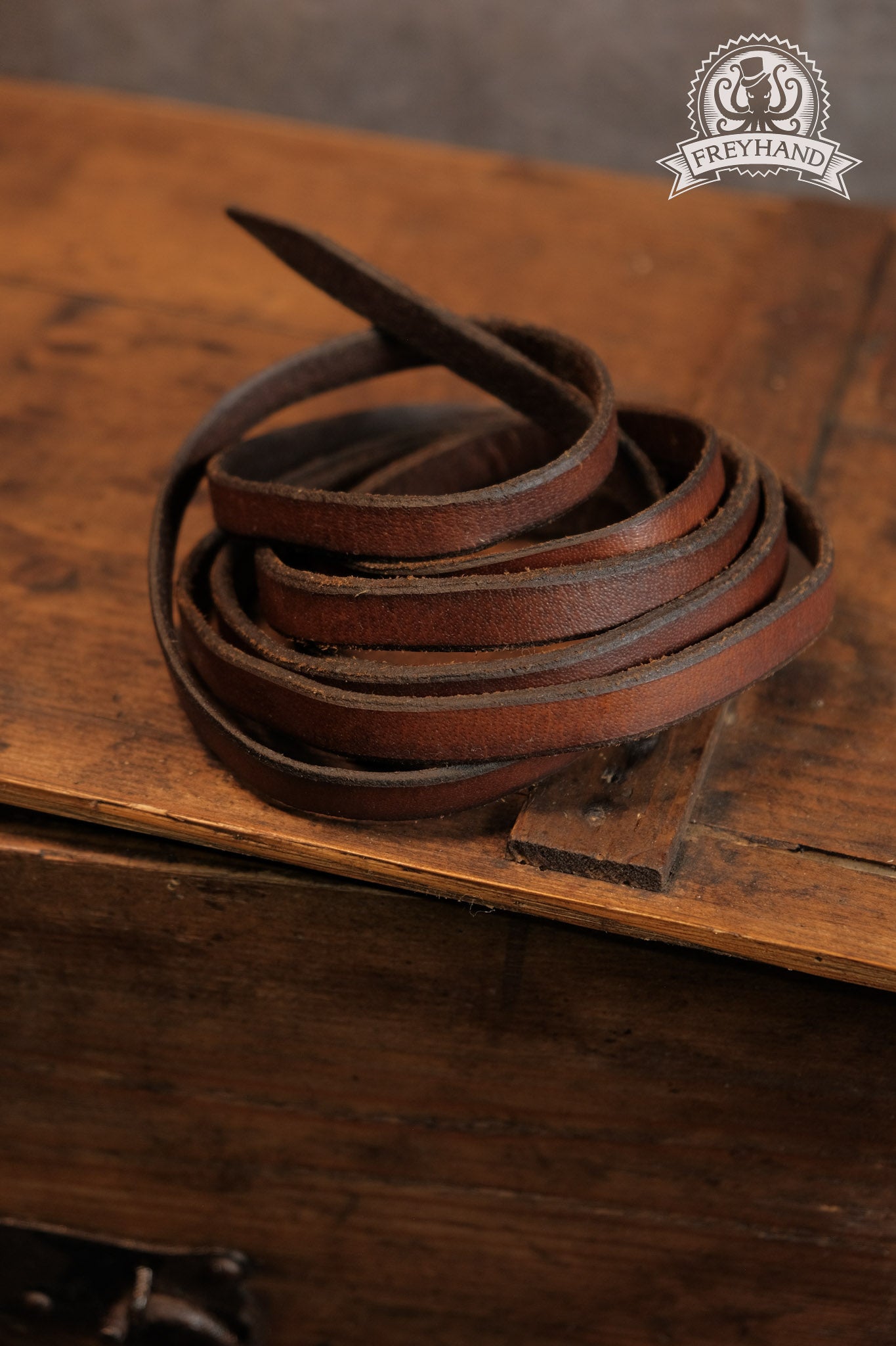 Dieser schmale Riemen kommt ohne Schnalle aus, einfach durch das Loch am Riemenende ziehen und mit einem Knoten Schließen. Gut geeignet um Dolch und Schwertscheiden zu tragen.