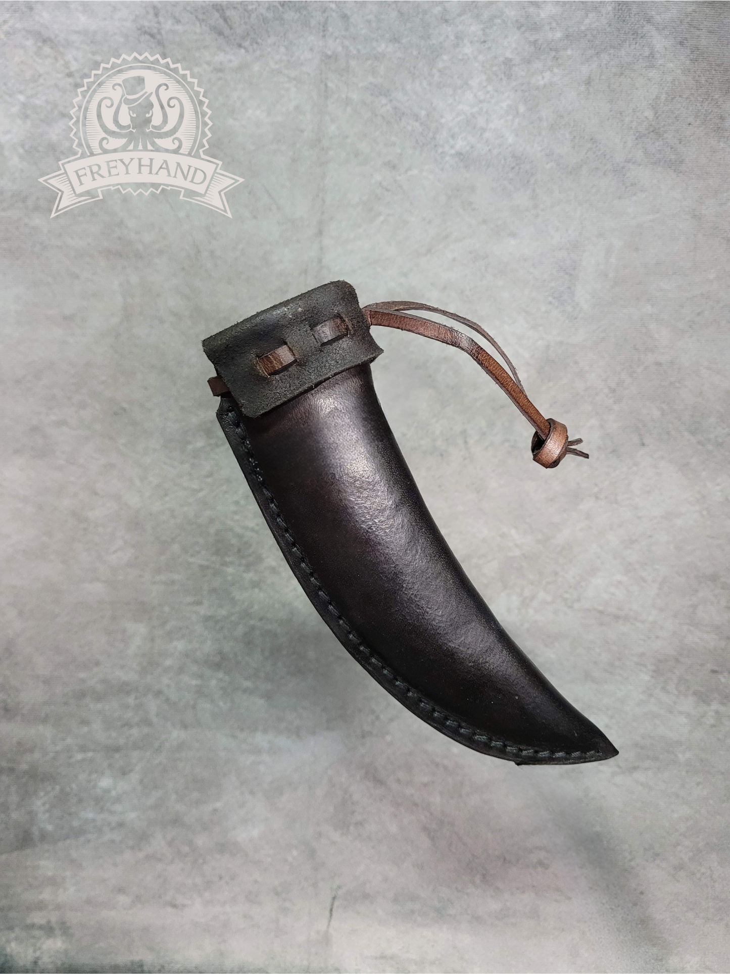 Messerscheide für kleine gebogene Larp Messer mit geflochtener Verzierung, Kann mit dem Flechtband am Gürtel befestigt werden.